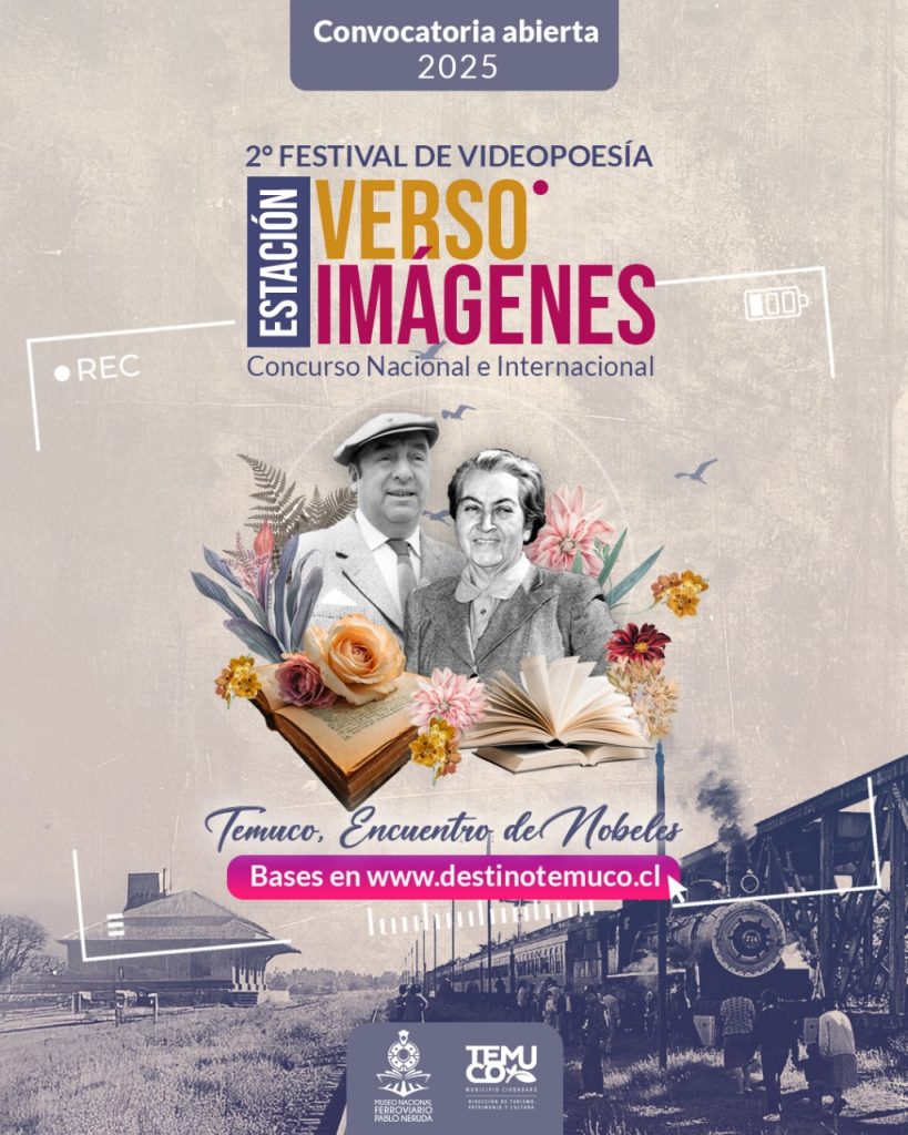 La Municipalidad de Temuco, a través de su Dirección de Turismo, Patrimonio y Cultura, en conjunto con el Museo Nacional Ferroviario Pablo Neruda, anuncia la apertura de la convocatoria para la segunda edición del Festival Internacional de Video Poesía “Estación Verso Imágenes – Temuco, encuentro de Nobeles”, que se celebrará en octubre de 2025 en la ciudad de Temuco. Este año, el certamen pone especial énfasis en rendir homenaje a los dos Premios Nobel de Literatura de Chile: Gabriela Mistral y Pablo Neruda, reconociendo su invaluable aporte a la poesía, la cultura y la identidad nacional y local.